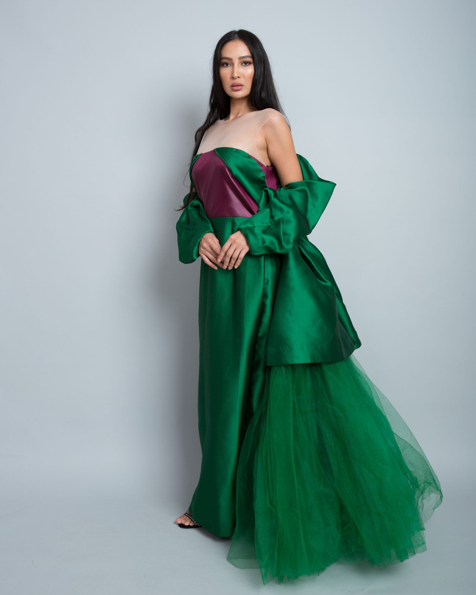 A luxurious evening gown crafted from Baratia silk, renowned for its elegant texture and soft sheen. The bodice features a plum-colored silk top with an emerald green base, complemented by a sheer tulle neckline and dramatic puff sleeves. A wide layered tulle train adds an artistic flair, combining luxury with contemporary sophistication. Perfect for upscale evening events and formal occasions.