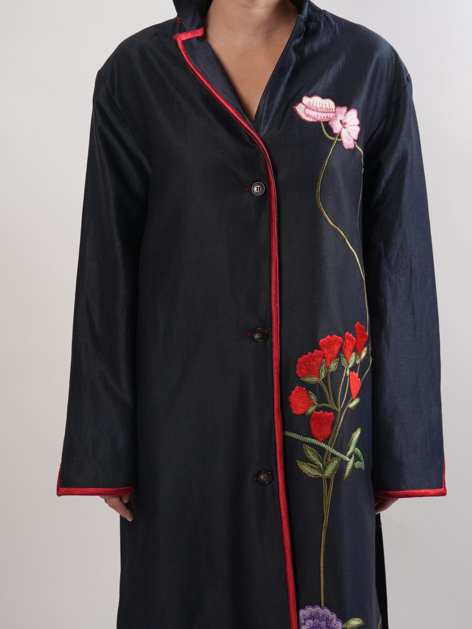 A navy blue linen long coat with handmade embroidered floral details for an elegant and refined look.