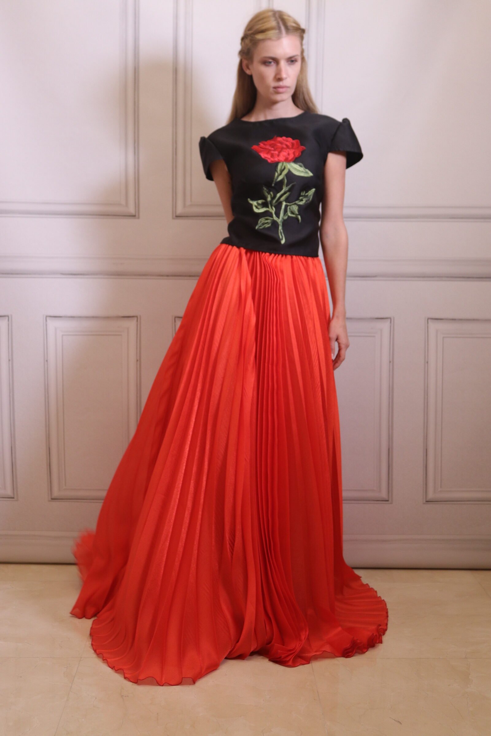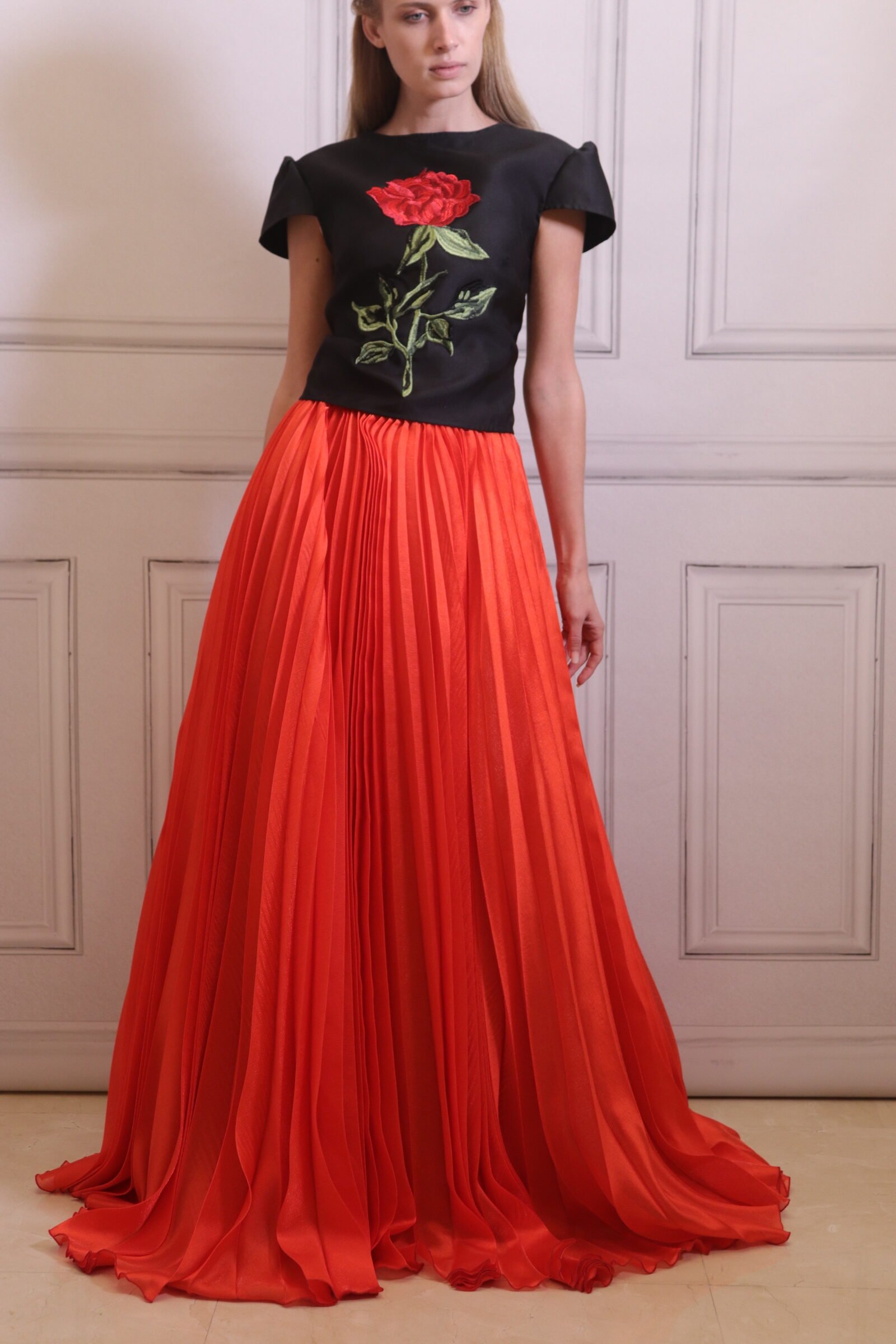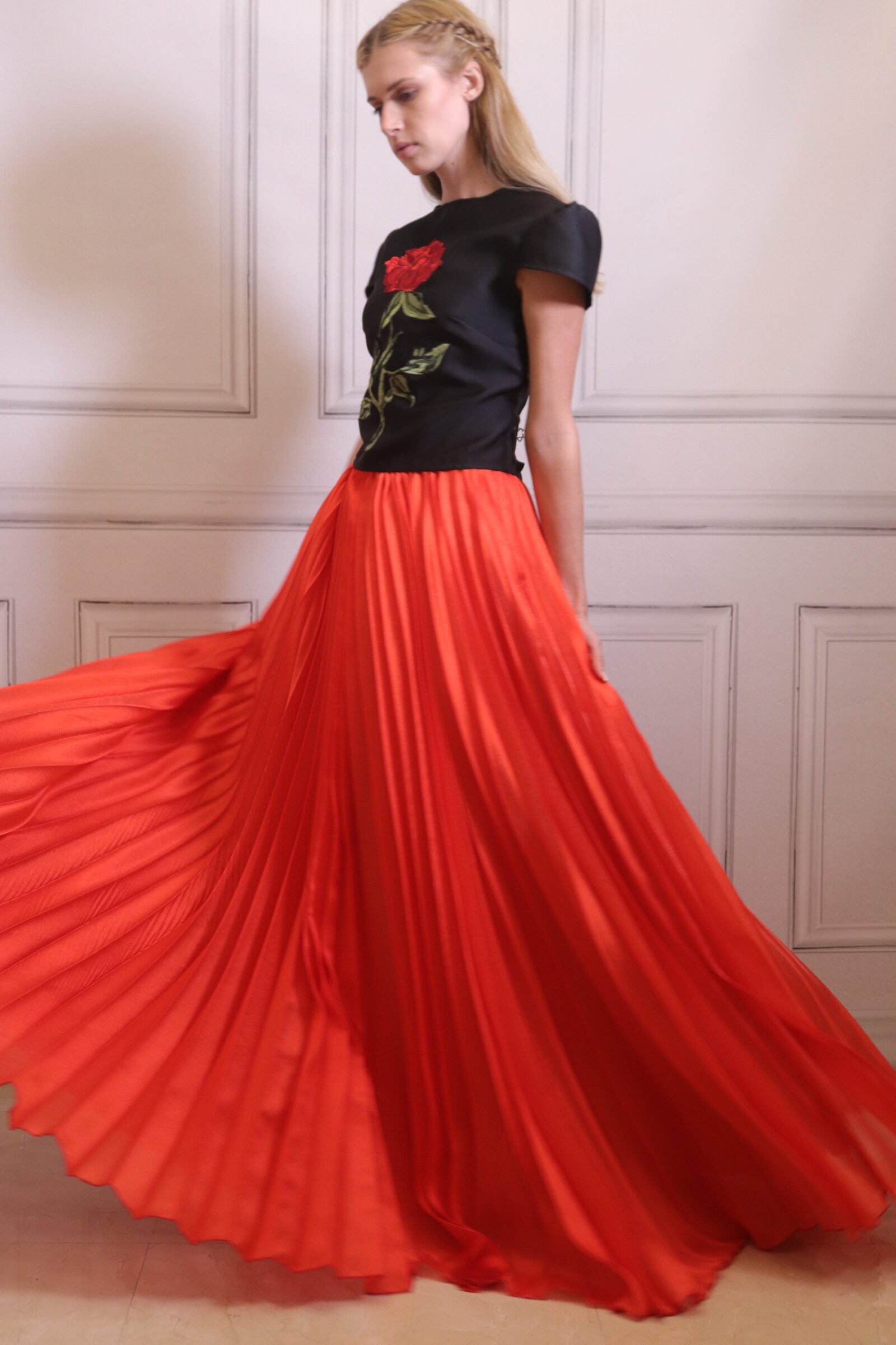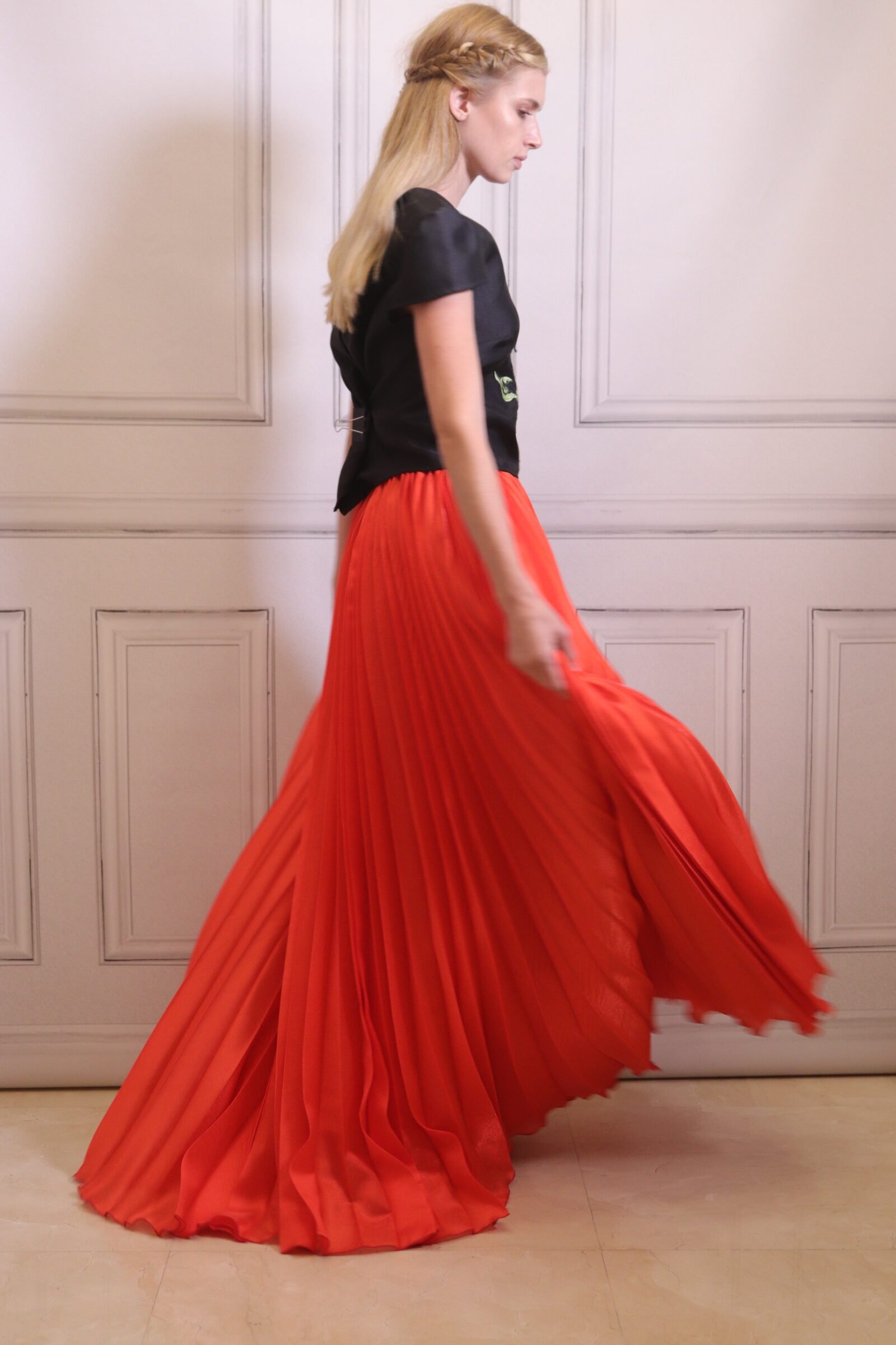 A long red skirt featuring delicate pleats that create graceful movement and fluidity with every step. Designed with a high waist and wide silhouette, it offers a dramatic yet elegant appearance. Perfect for evening occasions and standout looks, this skirt combines classic luxury with a contemporary bold touch.