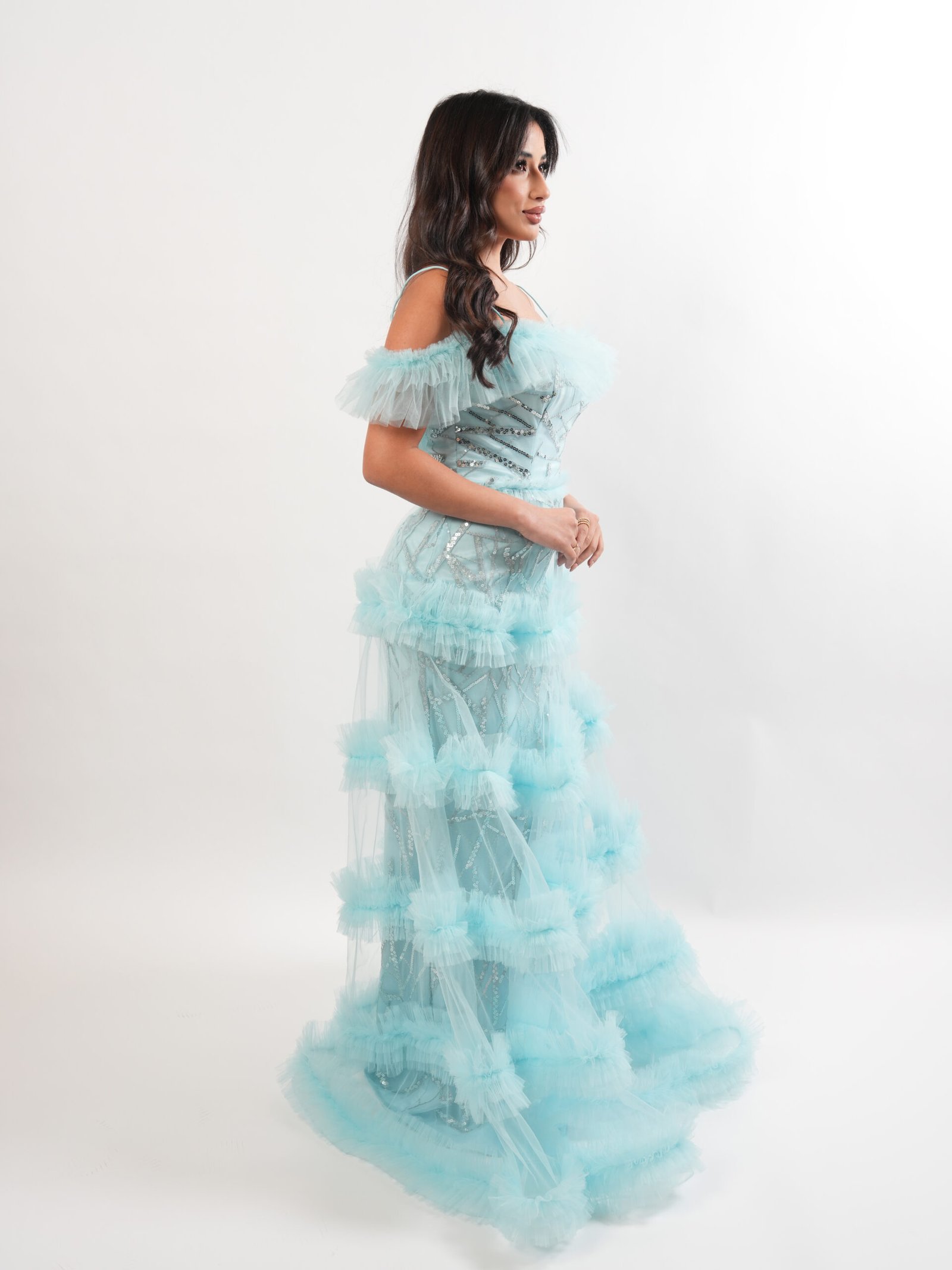 The HOPE Off-Shoulder Ruffle Long Dress is an elegant and feminine design featuring an off-shoulder neckline accented with soft ruffle detailing. Designed in a long, flowing silhouette, this dress offers graceful movement and refined sophistication, making it ideal for evening events, formal occasions, and special celebrations.