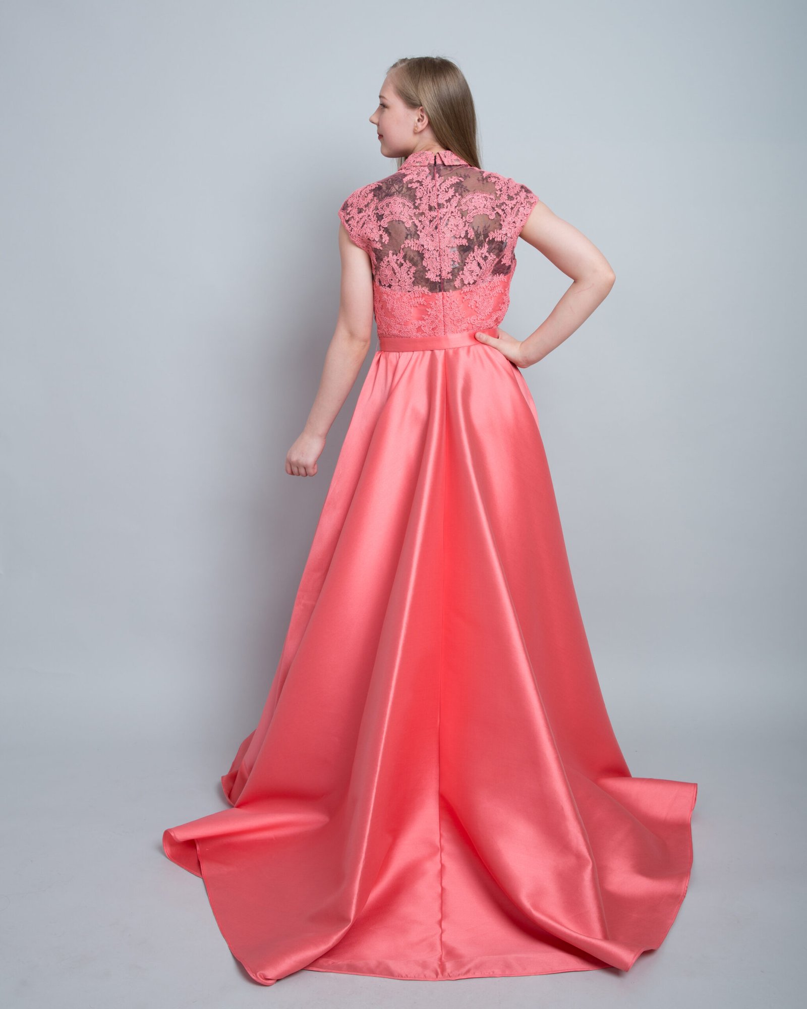 A stunning evening gown in a soft pink shade, featuring a wide satin skirt with elegant sheen and graceful flow. The bodice is adorned with luxurious lace and a classic neckline, complemented by a waist belt that creates a flattering feminine silhouette. Crafted from premium silk satin with lace details, this gown perfectly combines elegance with contemporary luxury.