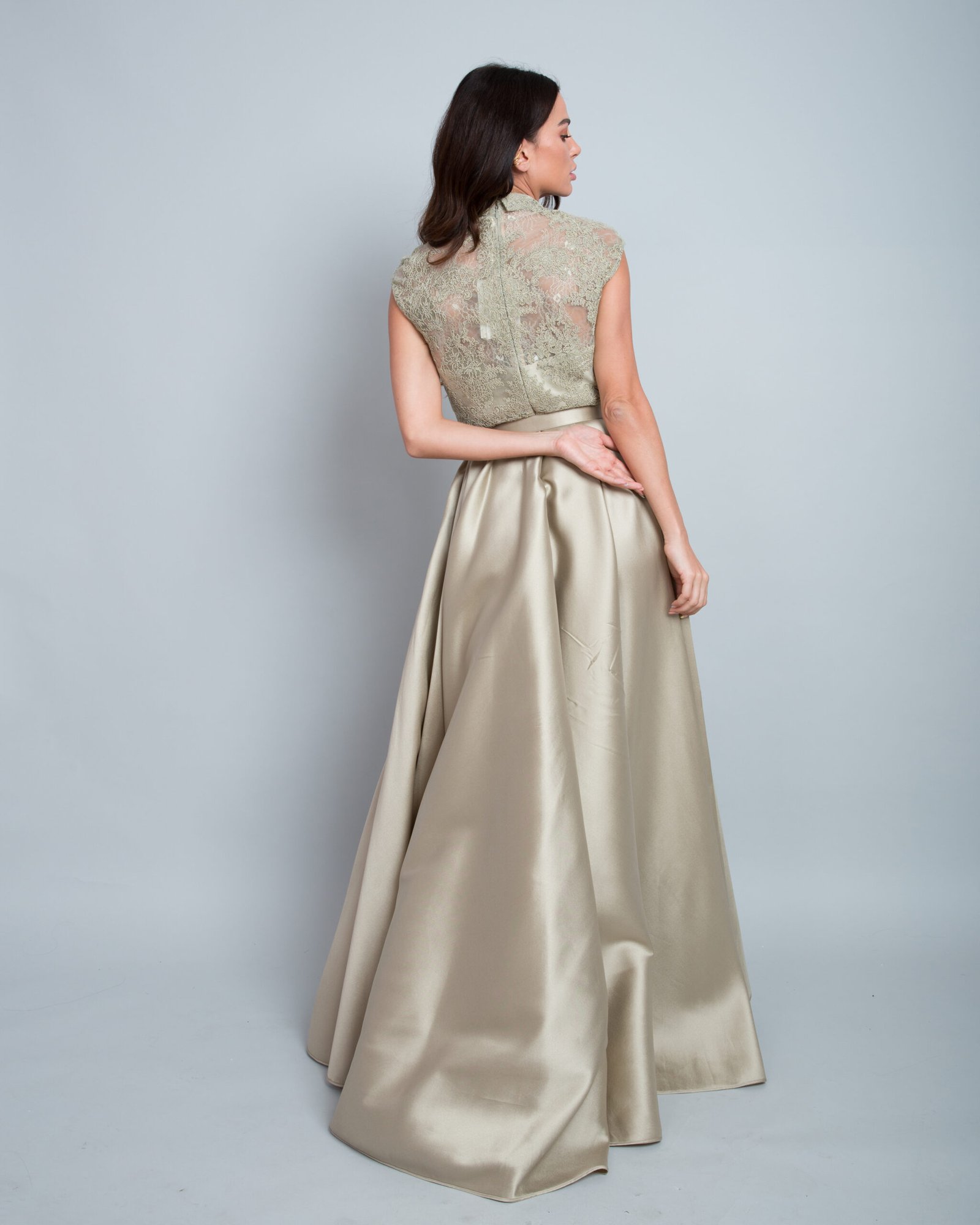 An elegant evening gown in a champagne beige shade, featuring a wide flowing skirt and a waist belt that enhances the silhouette. Adorned with luxurious lace and crafted from silky satin fabric, it offers a refined sheen and a premium, sophisticated feel.
