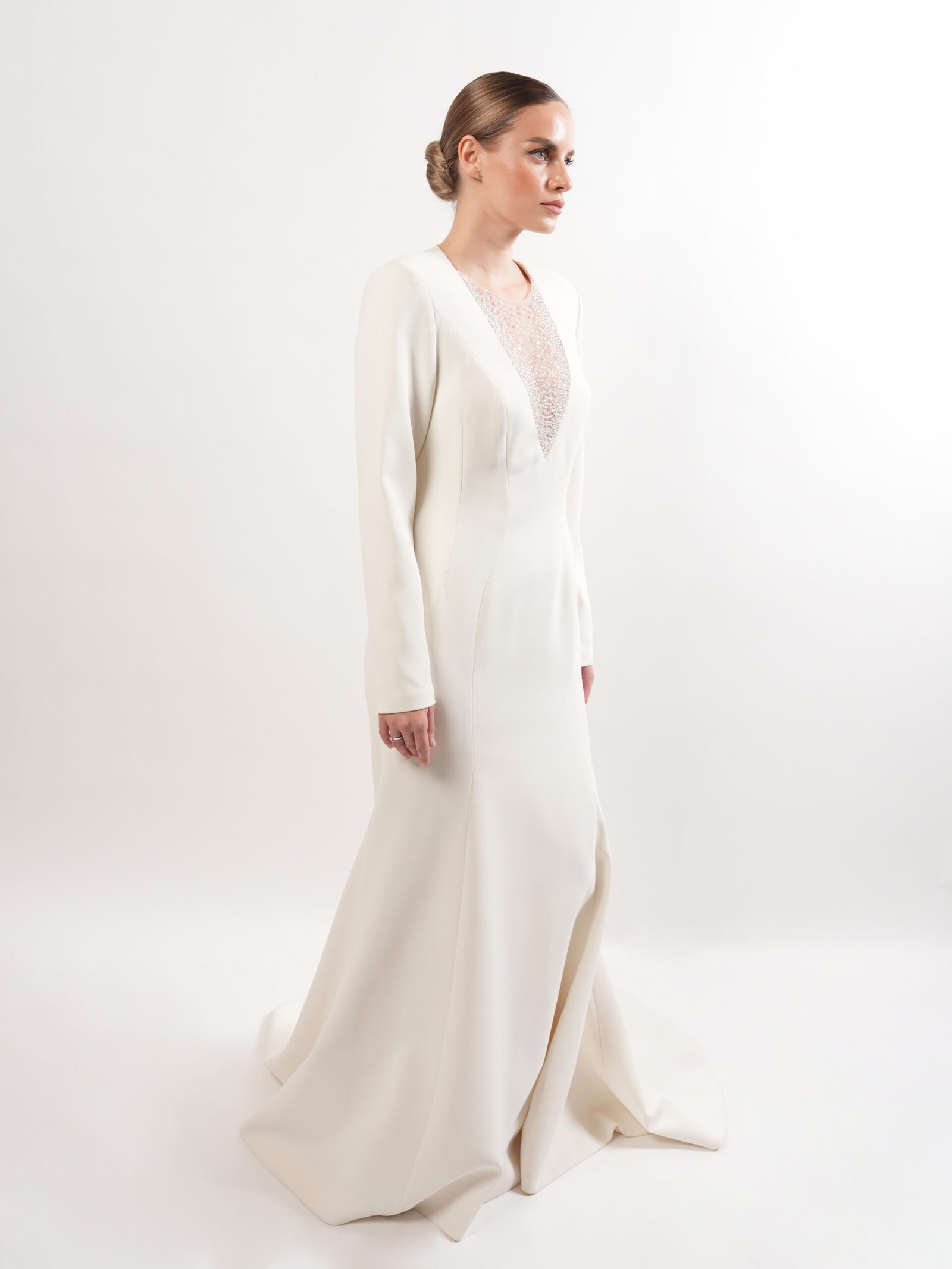 The Ecaille Long Dress is an elegant evening gown crafted from luxurious crepe silk, featuring intricate embroidery adorned with gold Swarovski stones. Designed for a sophisticated silhouette, it combines refined craftsmanship with sparkling details, making it a perfect choice for formal events, galas, and special occasions.