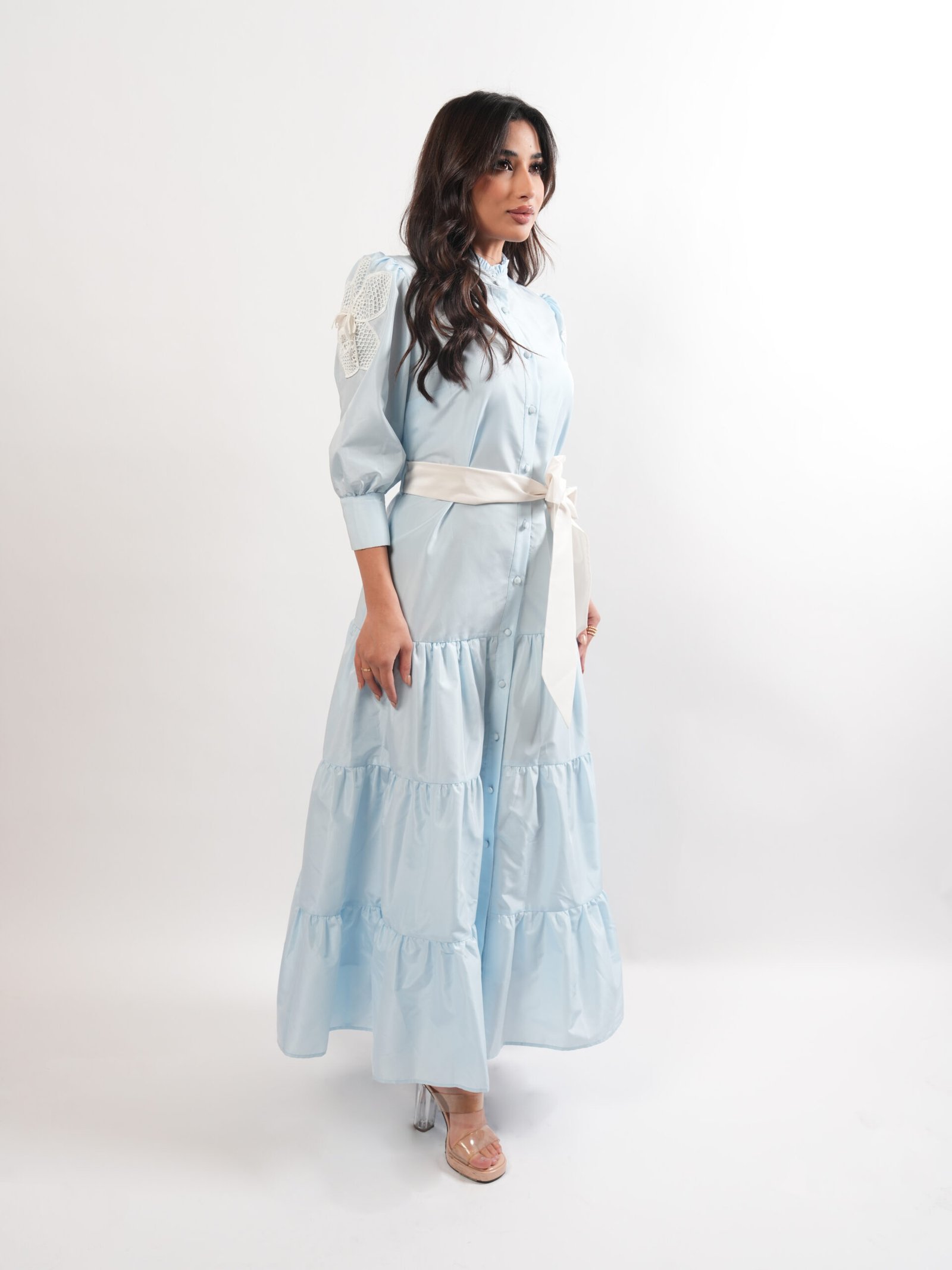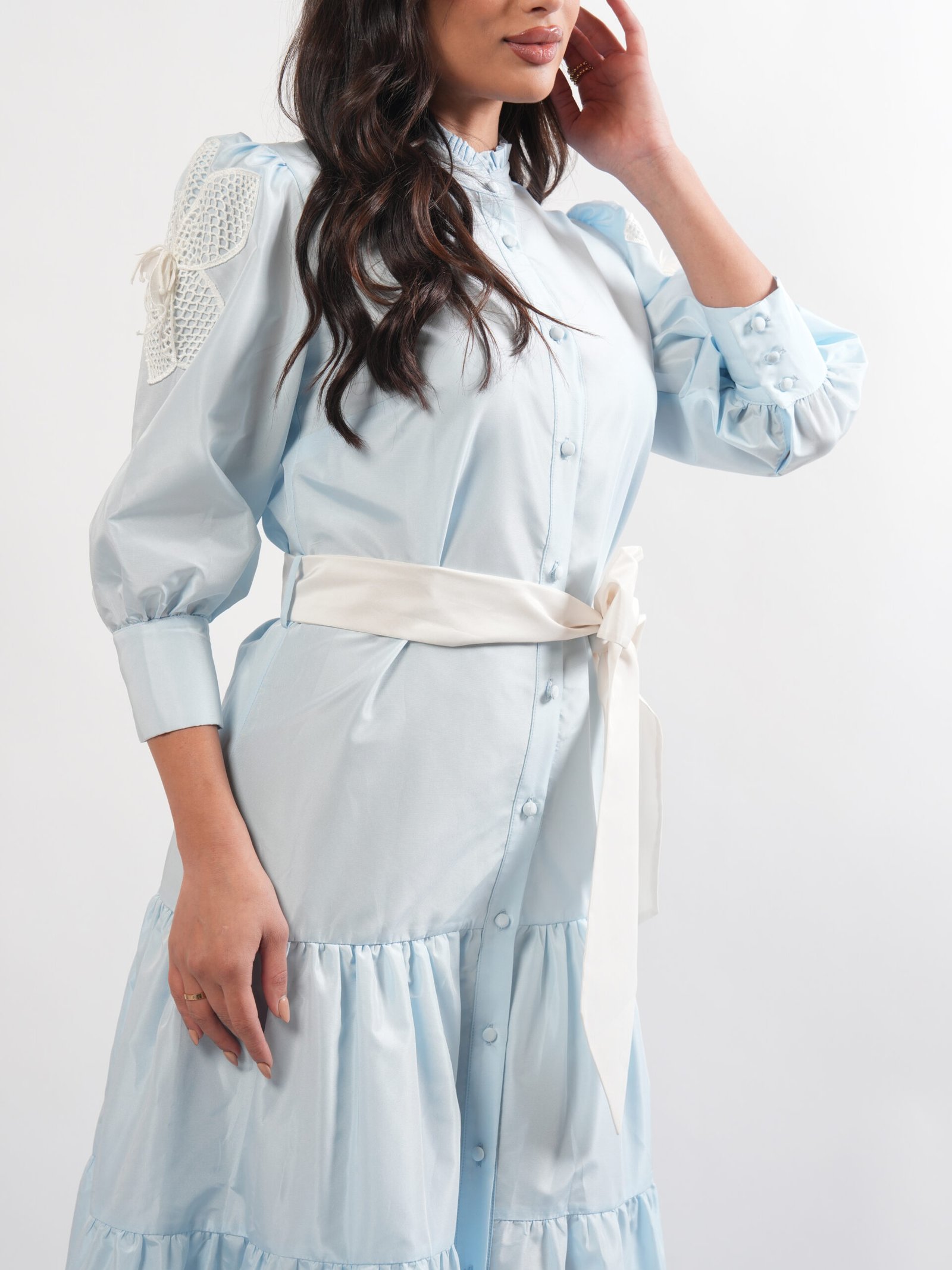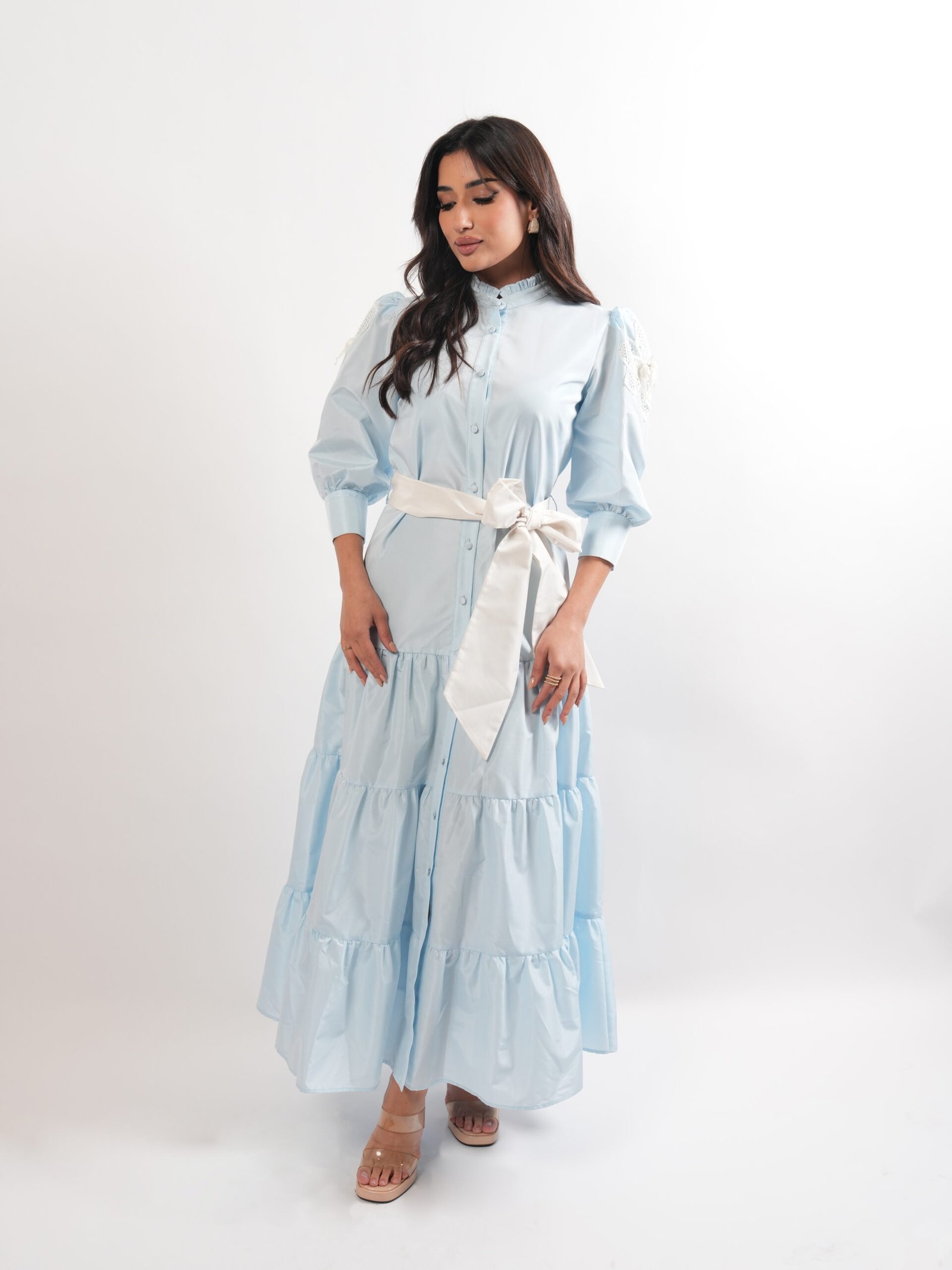 The MAVI Kollari Nakisli Dress is a charming and elegant outfit in a soft baby blue shade, featuring delicate embroidery on the sleeves. It is complemented by a white belt that accentuates the waist and adds a refined touch. Perfect for formal events, parties, or special occasions, this dress combines sweetness with sophisticated detailing.