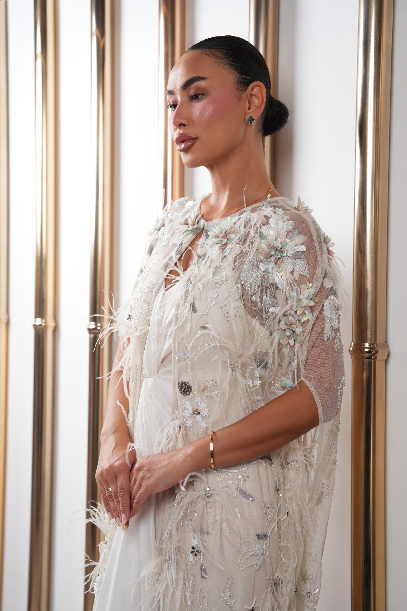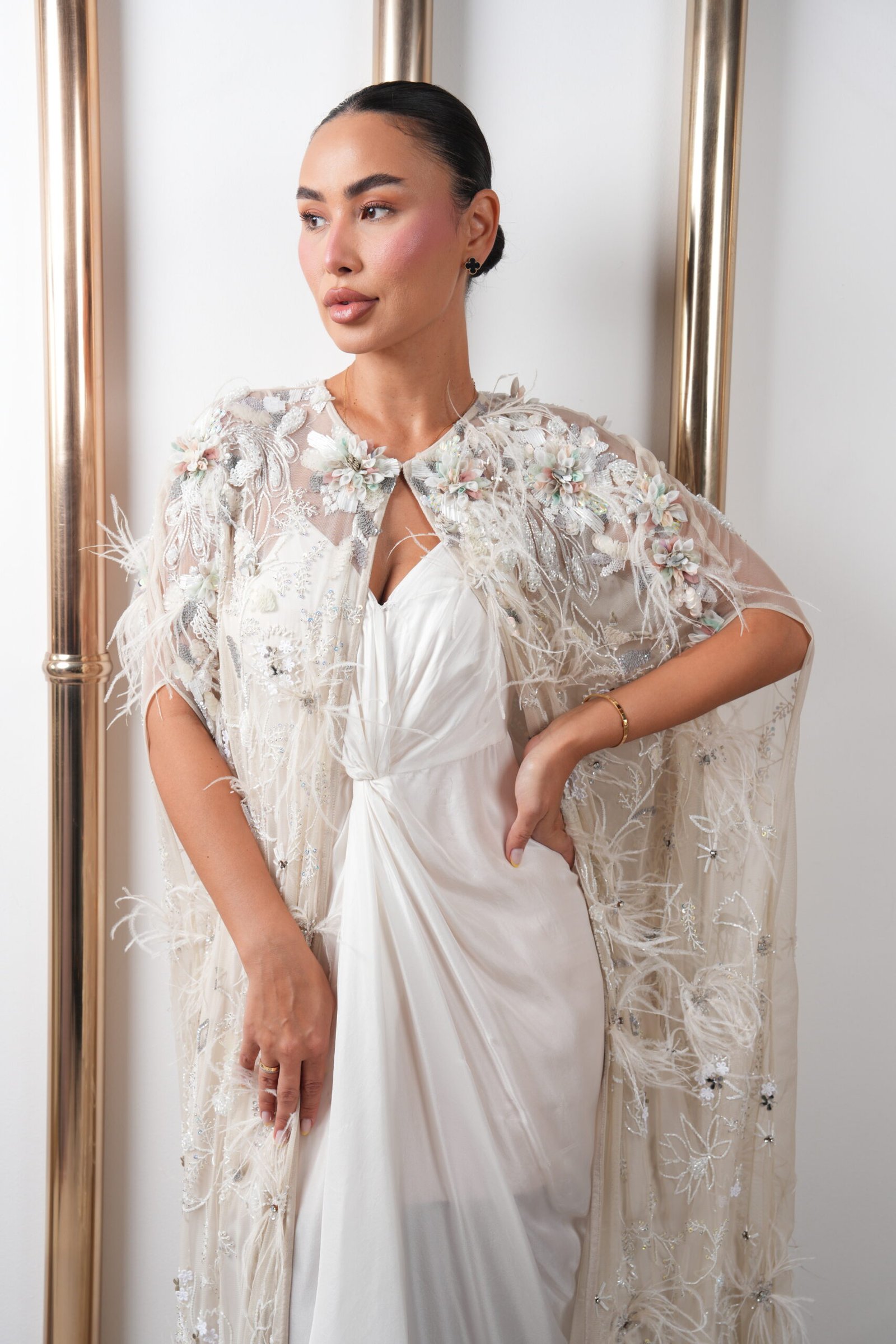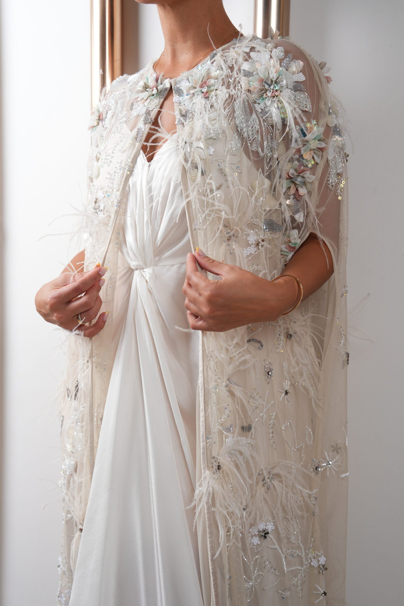 A luxurious ivory ensemble featuring a sheer cape adorned with delicate floral embroidery, elegant feathers, and sparkling bead accents, adding depth and a unique charm. It is paired with a flowing satin knotted dress that enhances the silhouette with sophistication. Perfect for upscale evening events and special occasions requiring refined elegance.