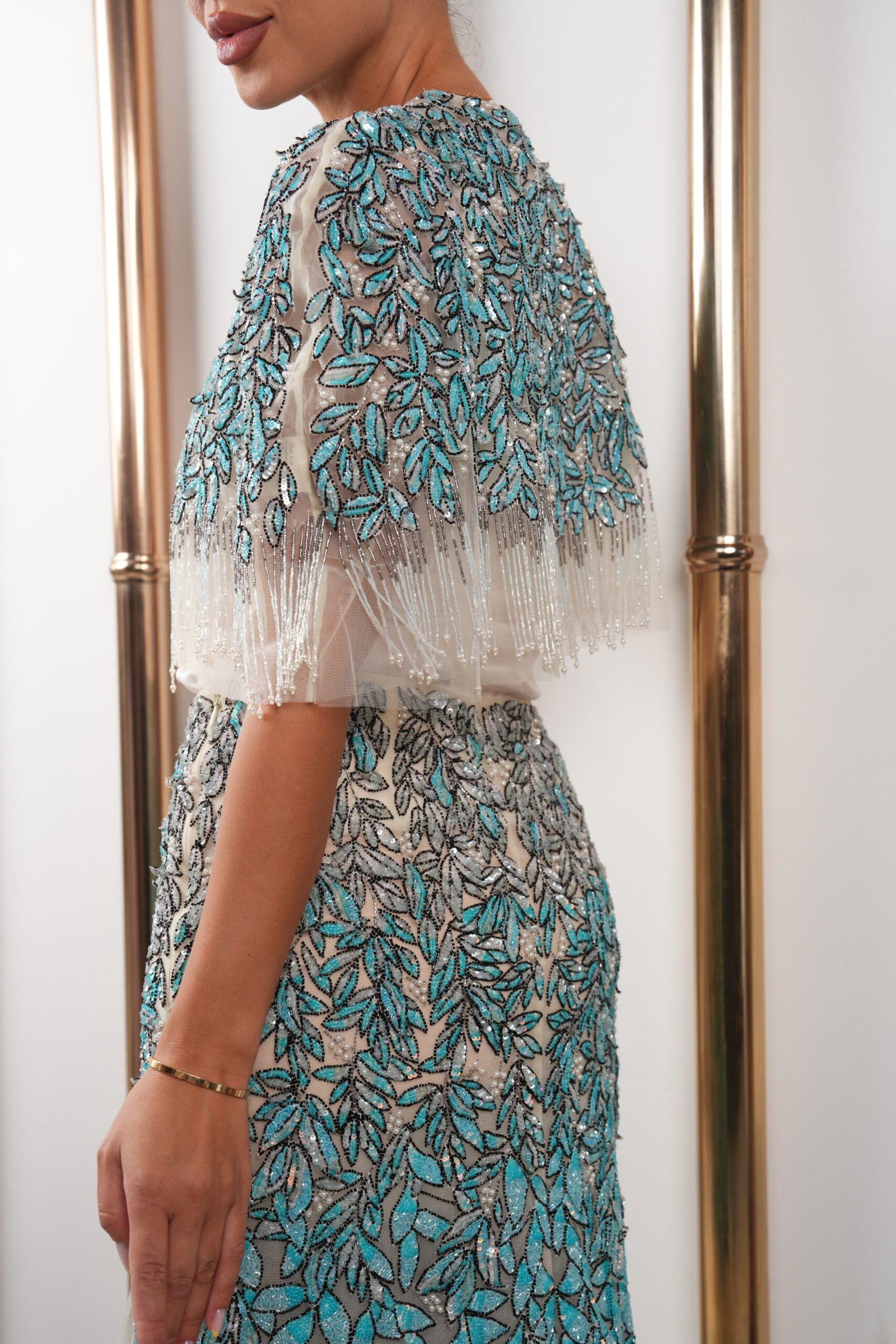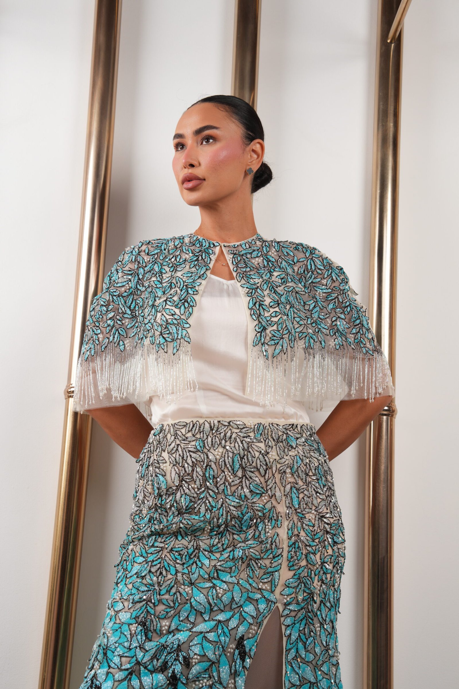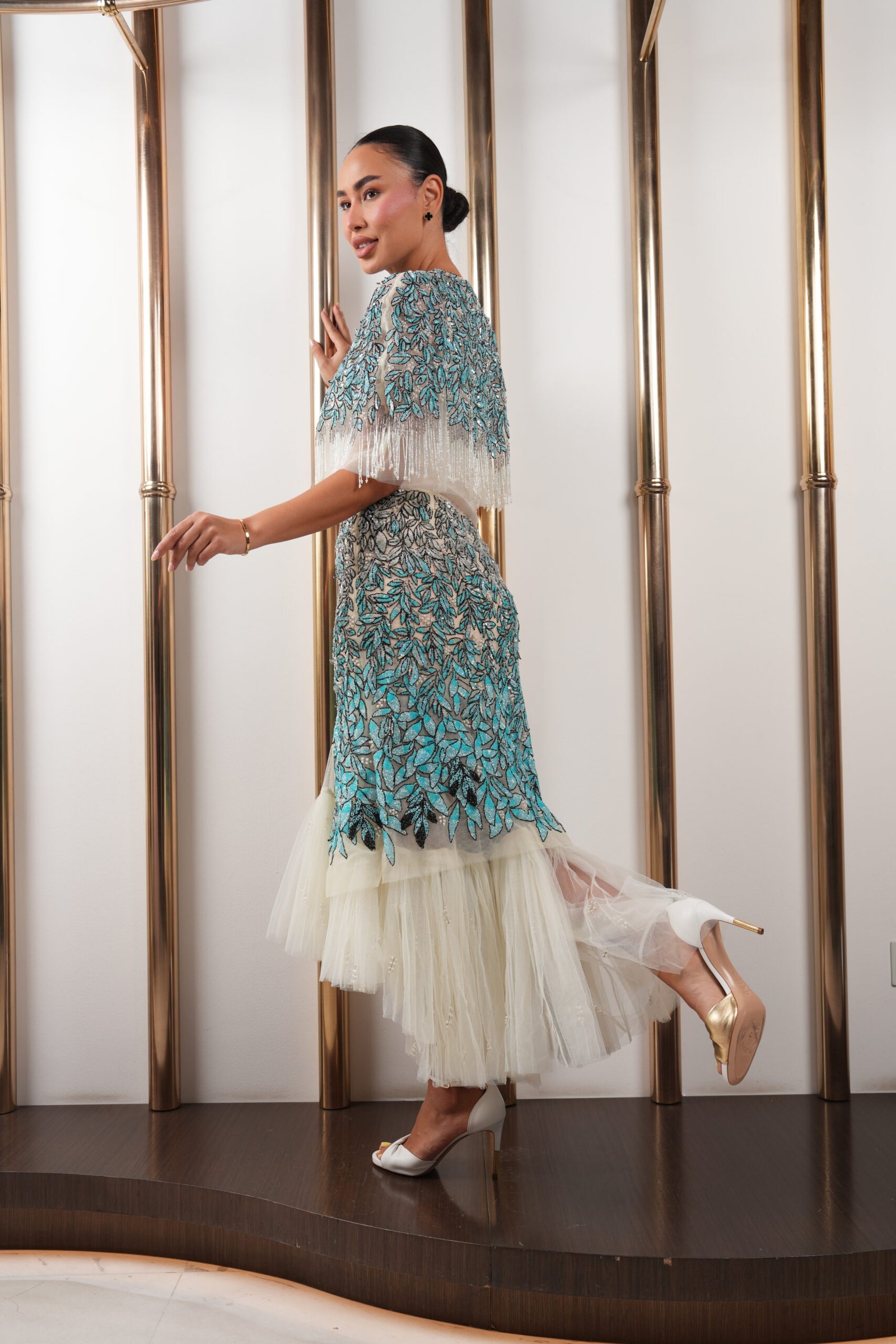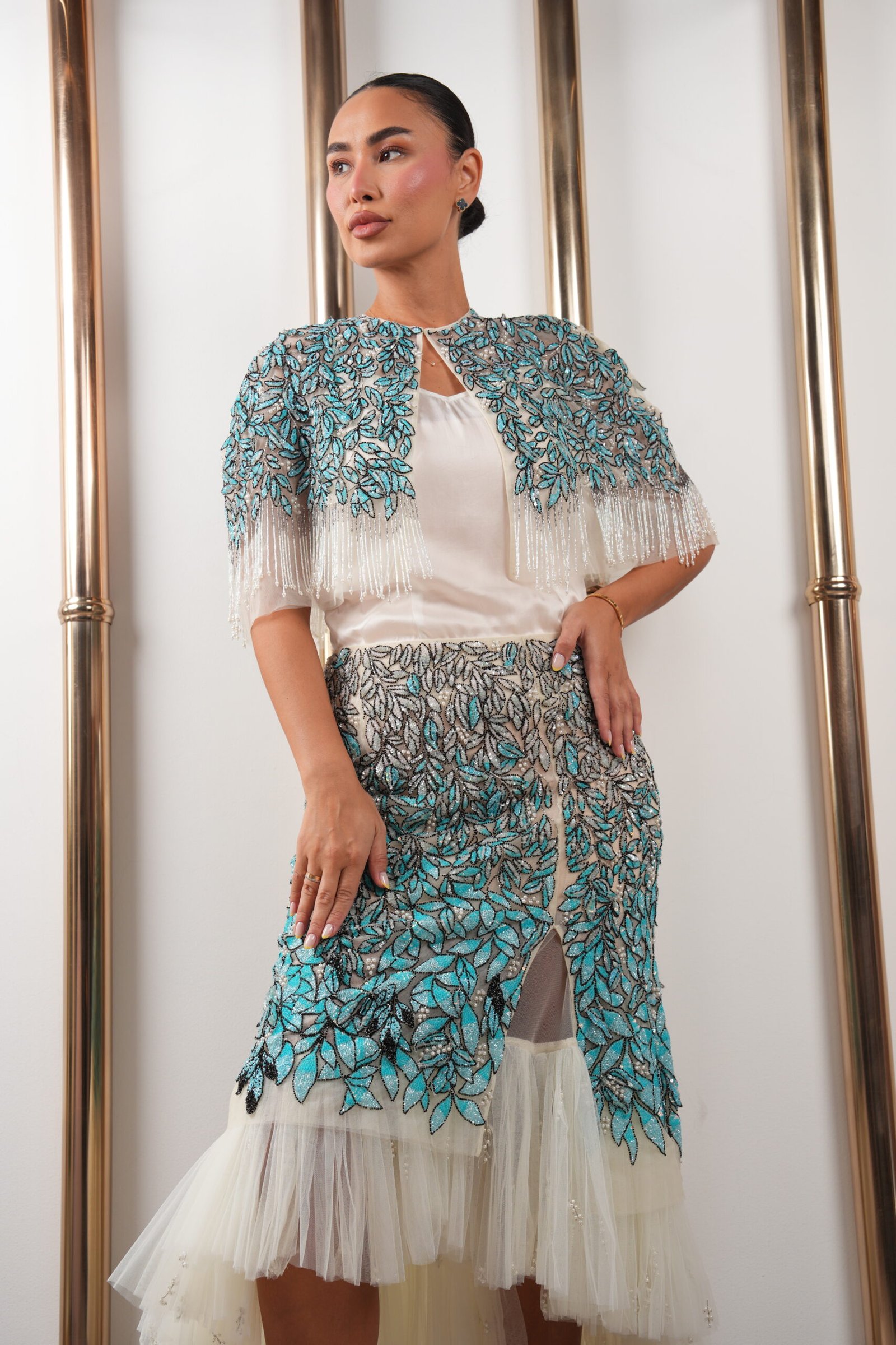 A sophisticated three-piece ensemble featuring a sheer cape embroidered with shimmering leaf motifs in turquoise and silver, paired with a soft top and a layered, ruffled skirt. The design is completed with delicate embroidery and flowing edges that add depth and dynamic movement. Perfect for formal occasions, this look combines artistry with refined elegance.