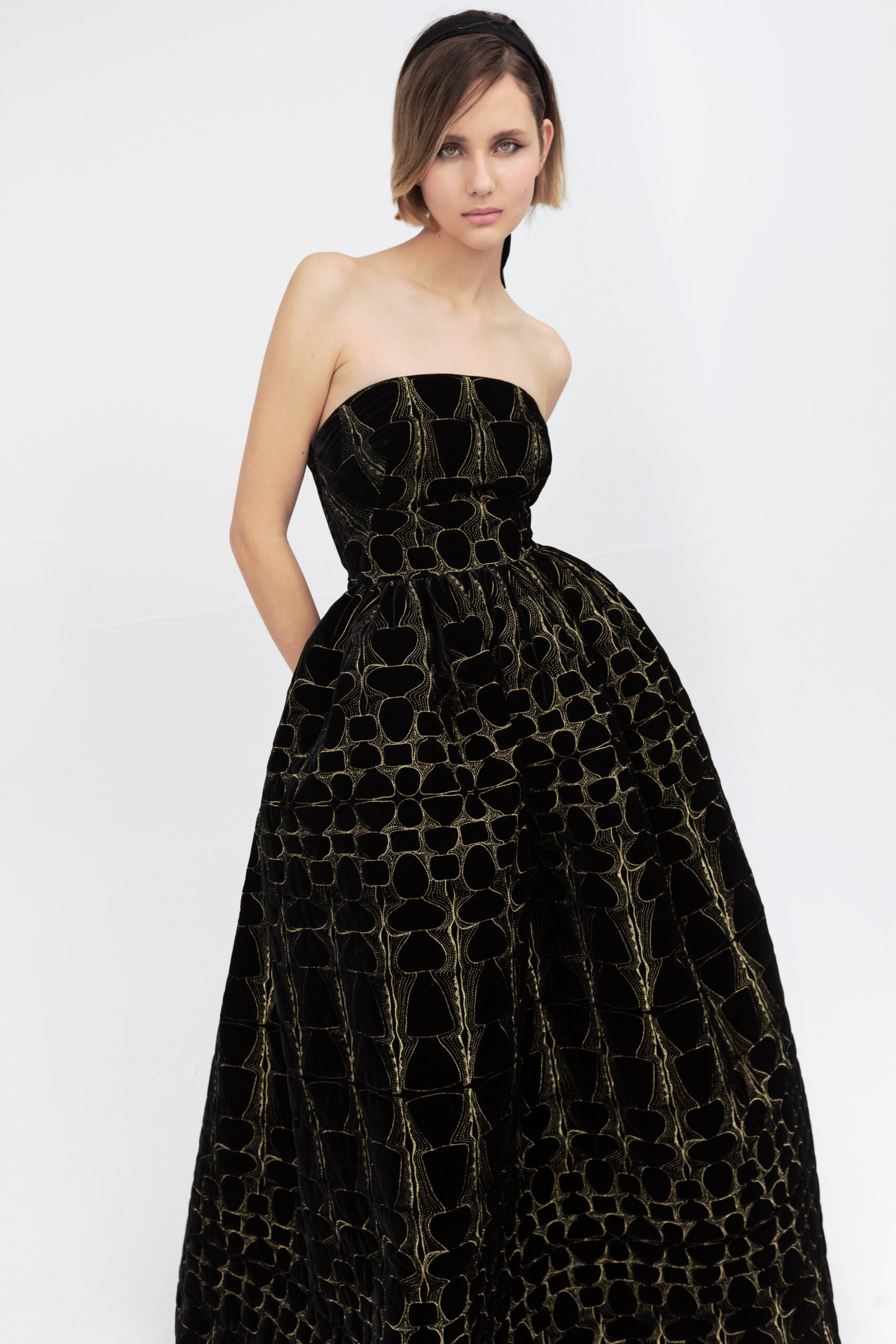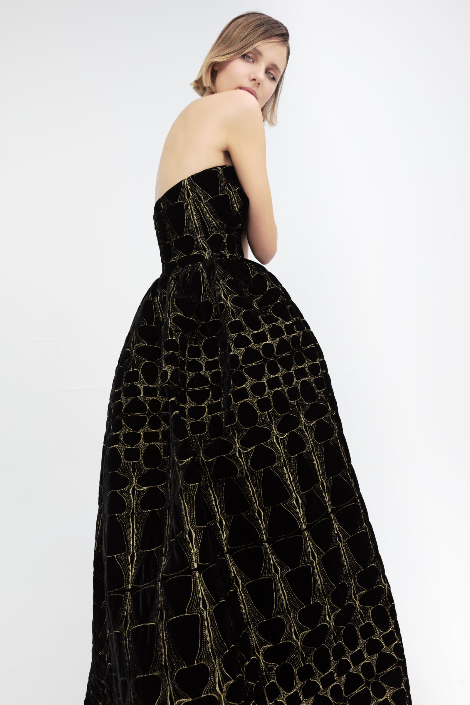 A strapless dark green velvet evening gown with gold embroidery, fitted bodice, and a dramatic flowing skirt.