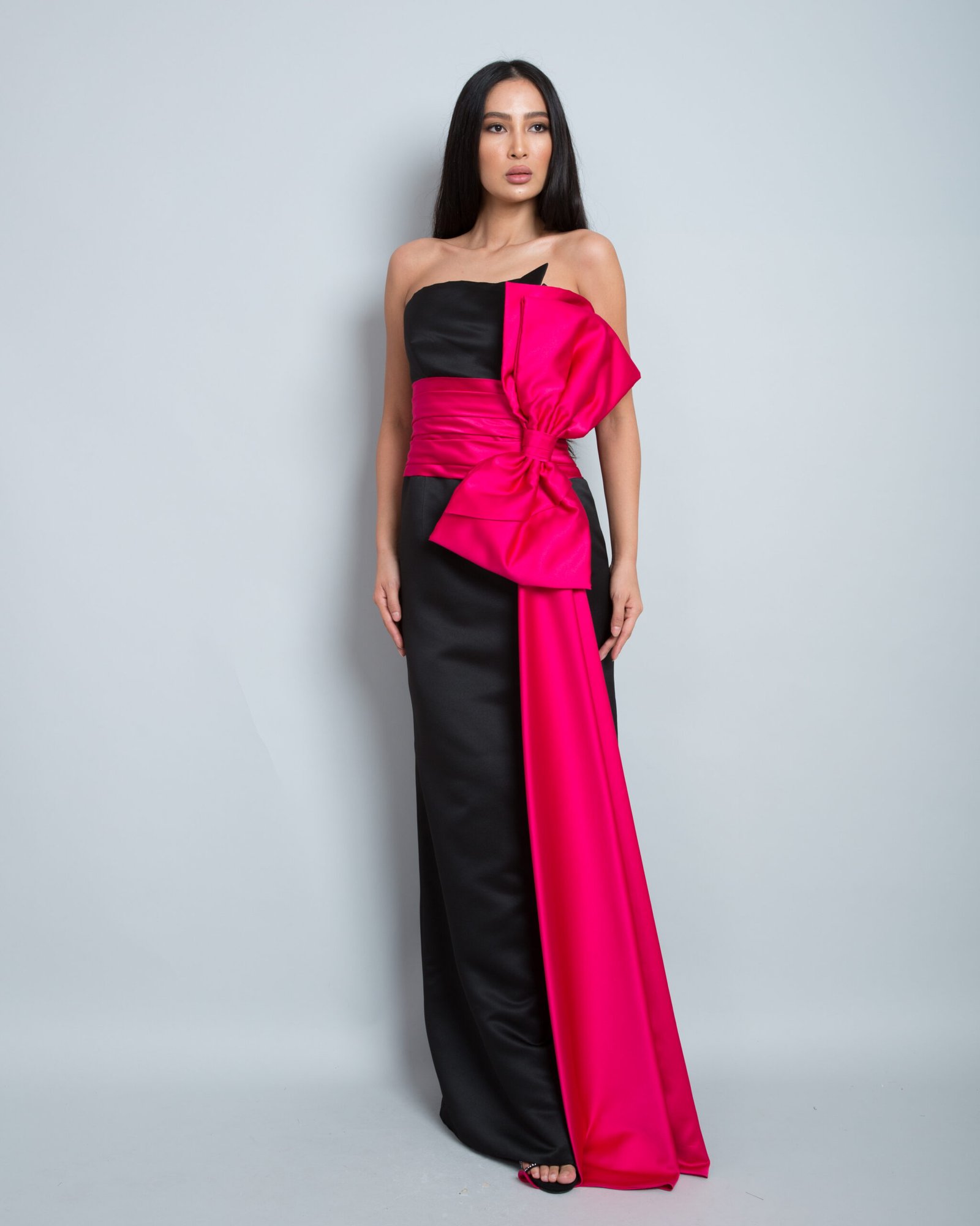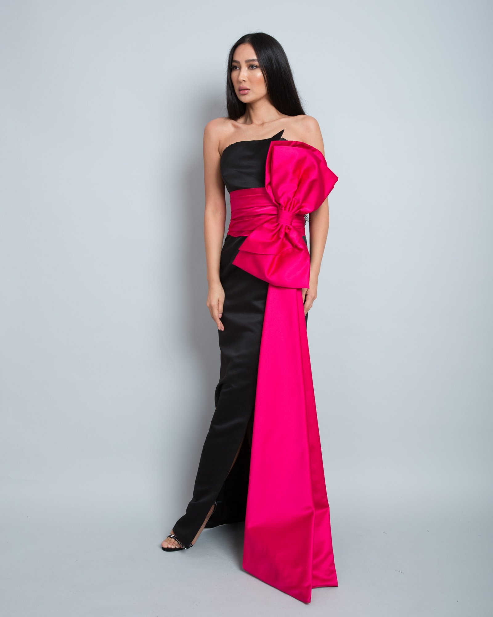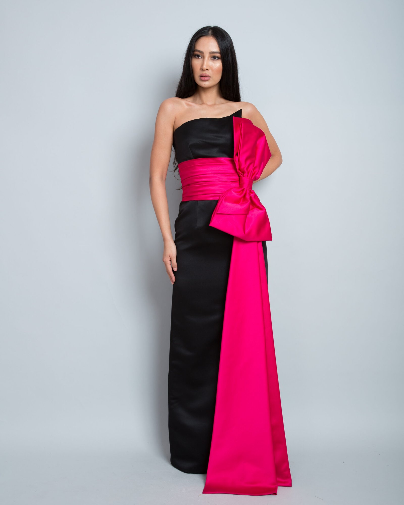 A stunning strapless evening gown crafted from luxurious satin fabric, combining an elegant black base with bold fuchsia accents. It features a striking oversized knot at the waist that cascades gracefully to the floor, creating a dramatic and sophisticated silhouette. Perfect for formal occasions, this gown delivers a refined, feminine, and captivating look.