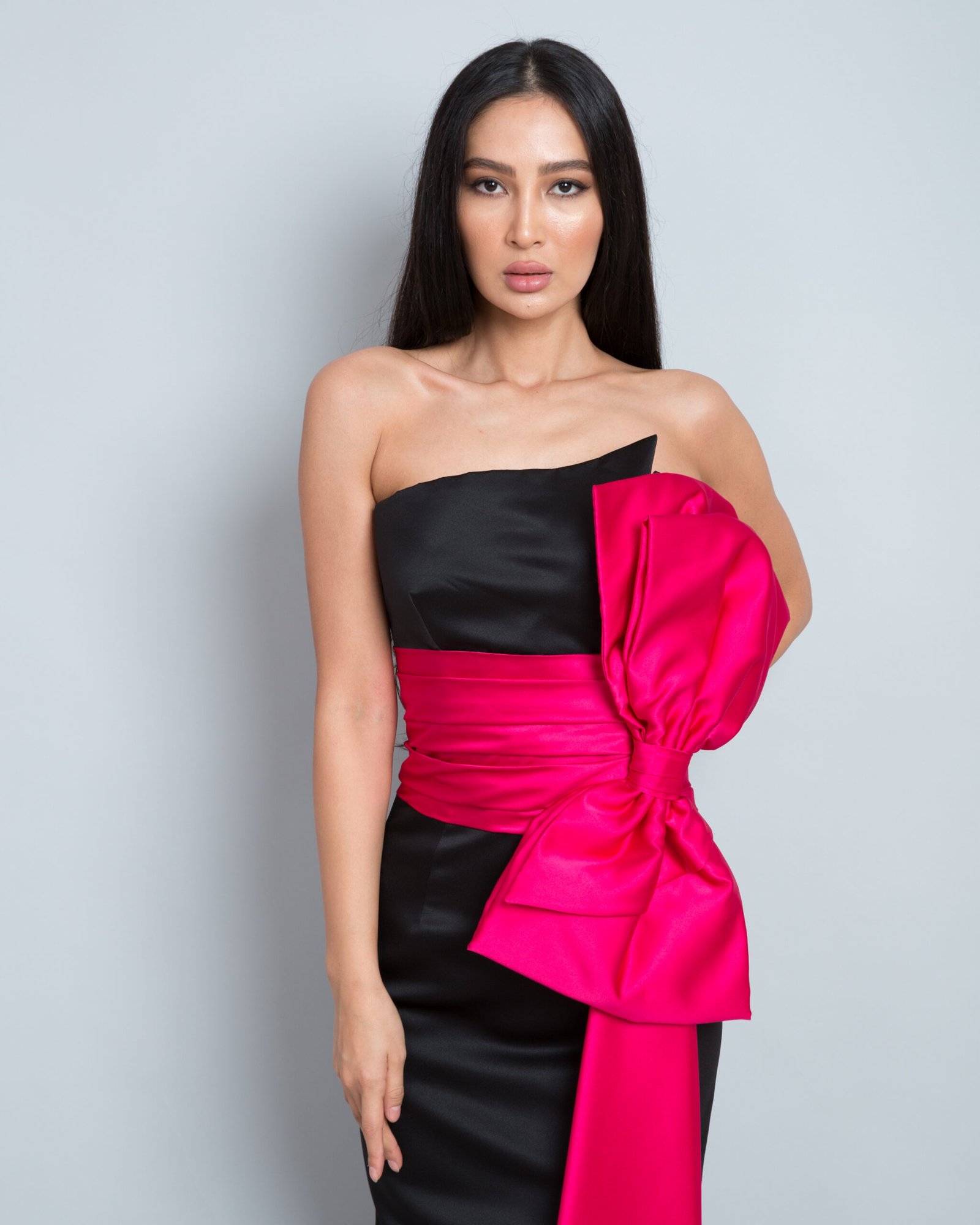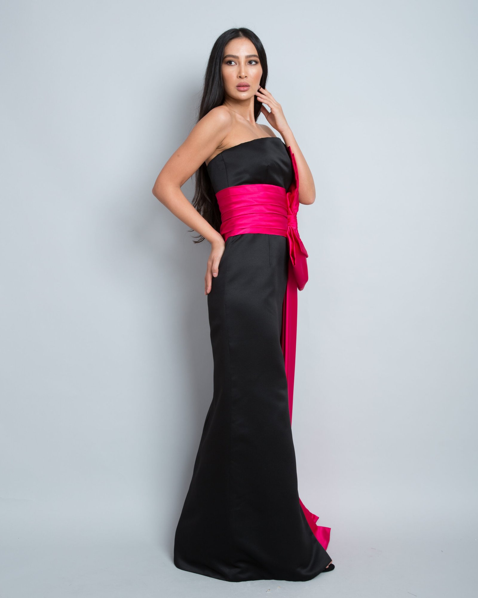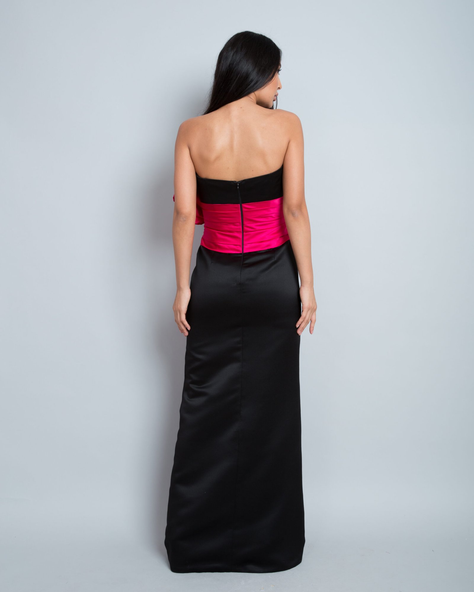 A stunning strapless evening gown crafted from luxurious satin fabric, combining an elegant black base with bold fuchsia accents. It features a striking oversized knot at the waist that cascades gracefully to the floor, creating a dramatic and sophisticated silhouette. Perfect for formal occasions, this gown delivers a refined, feminine, and captivating look.